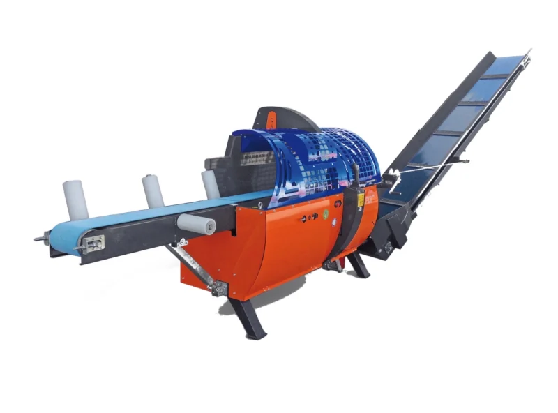 The machine has an infeed conveyor belt, and log grips hold the timber while the high-speed hydraulic chainsaw cuts it to your set length. Supports hold the log as it is cut, then release it into the splitting chamber.