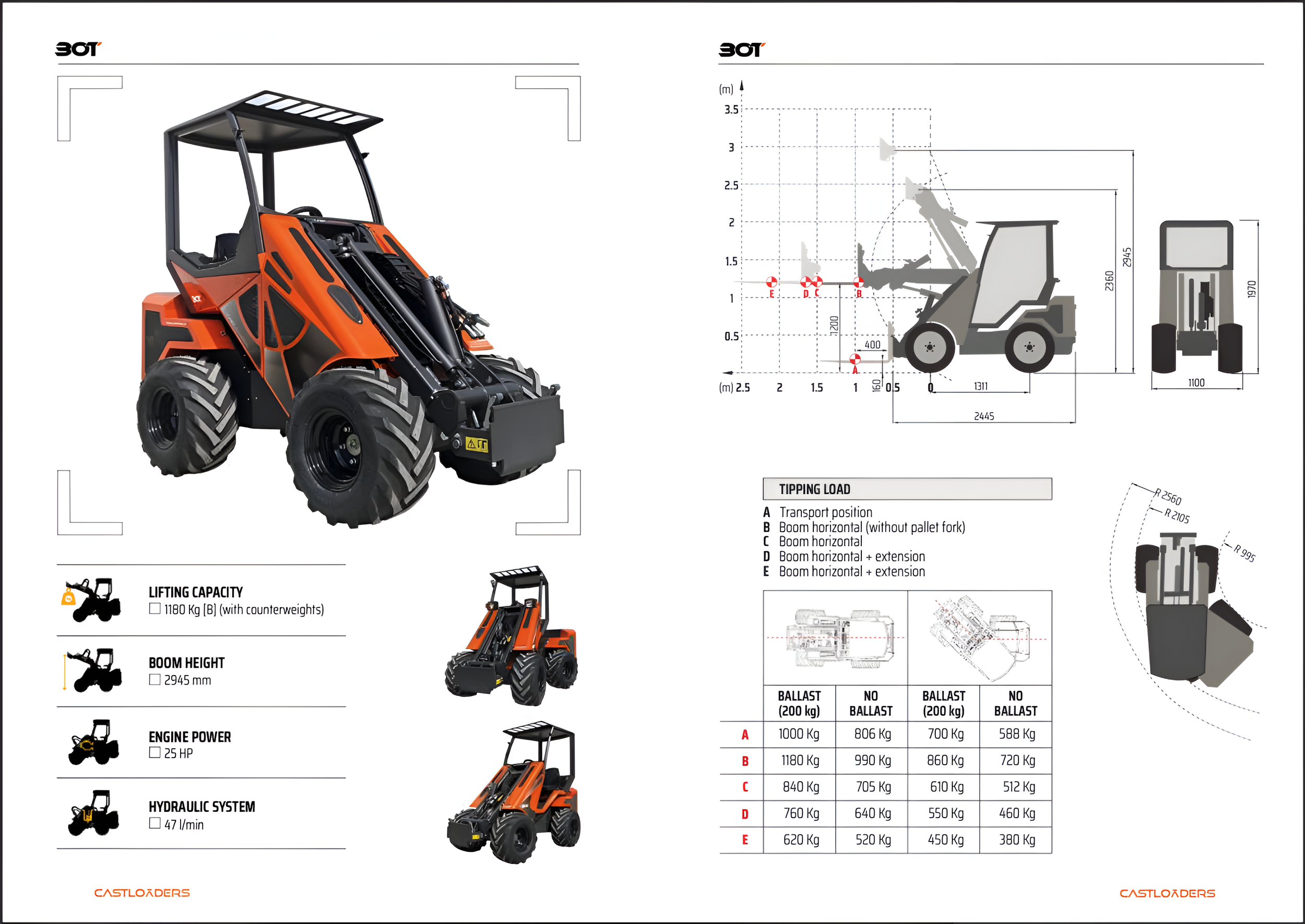 The Cast 30T Loader is a heavy-duty, high-performance machine designed to tackle demanding tasks in various industries. With its impressive lifting capacity of 1180 kg, this loader can easily handle heavy loads, making it an ideal choice for construction and material-handling applications. With 47 l/min of hydraulic flow, it can allow the operation of numerous attachments.