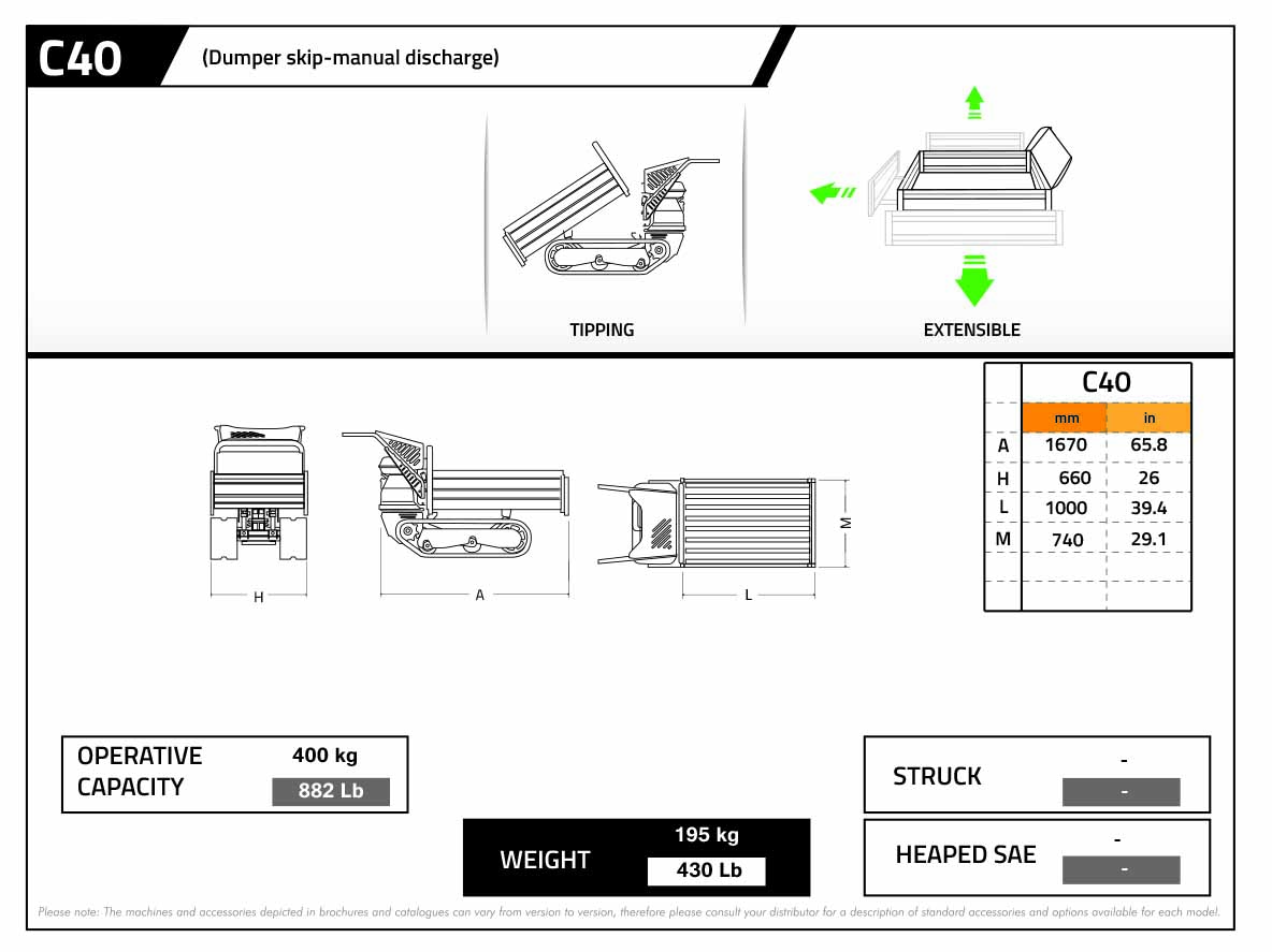 Another highlight of the 40 series mini-dumper is the widened and lengthened body, which allows the operator to have a much larger and more spacious loading area. The body can also be tilted through a particular lever mechanism fitted on the left side of the machine.