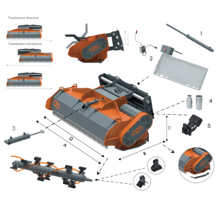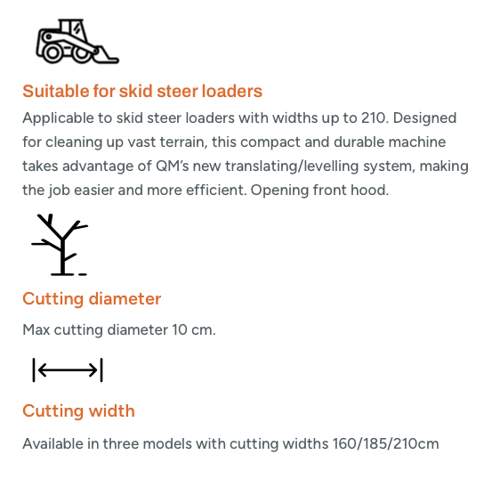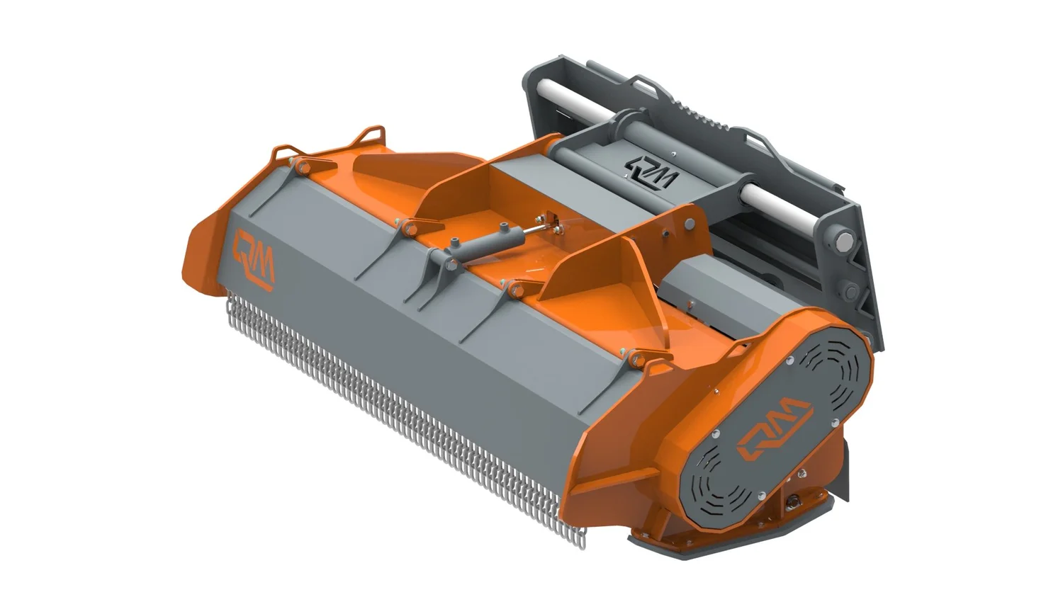 The RF Range Mulcher is applicable to Skid Loaders and Wheel Loaders with a universal front attachment plate to suit your machine. A compact and resistant body, combined with the new sliding/leveling system (patent pending QM), makes the mulcher very versatile and easy to use in many situations. This series has an opening front hood. It is equipped with the valve group “shockproof”, “anti-cavitation” and “pressure control and limitation”. Knives Y with intermediate or hammers, can be fitted as standard at the user’s preference. Designed for cleaning large areas and grounds. A compact and resistant body, combined with the new sliding/leveling system (patent pending QM), makes the mulcher very versatile and easy to use in many situations. This series has an opening front hood. It is equipped with the “shockproof”, “anti-cavitation” and “pressure control and limitation” valve group. It can be equipped with hammers or Y-shaped blades with intermediate.