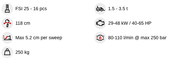 The recommended size of the loaders or tool carriers is 1.5 – 2.5 t with an oil flow rate of 50-75 l/min.
