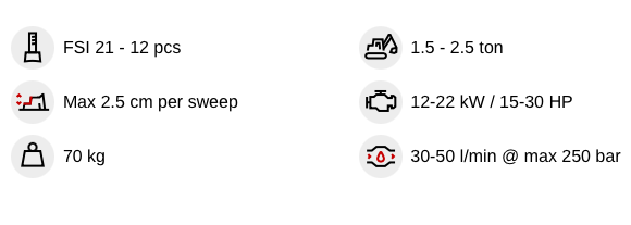 The recommended machine size is 1.5-2.5 t with an oil flow of 30-50 l/min.