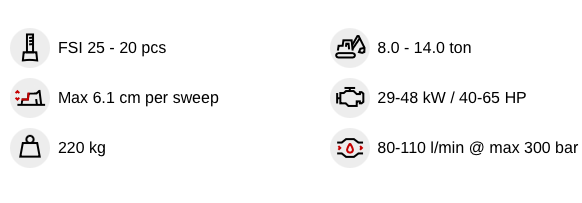 The recommended excavator size is 8 – 14 t with a flow rate of 80-110 l/min.